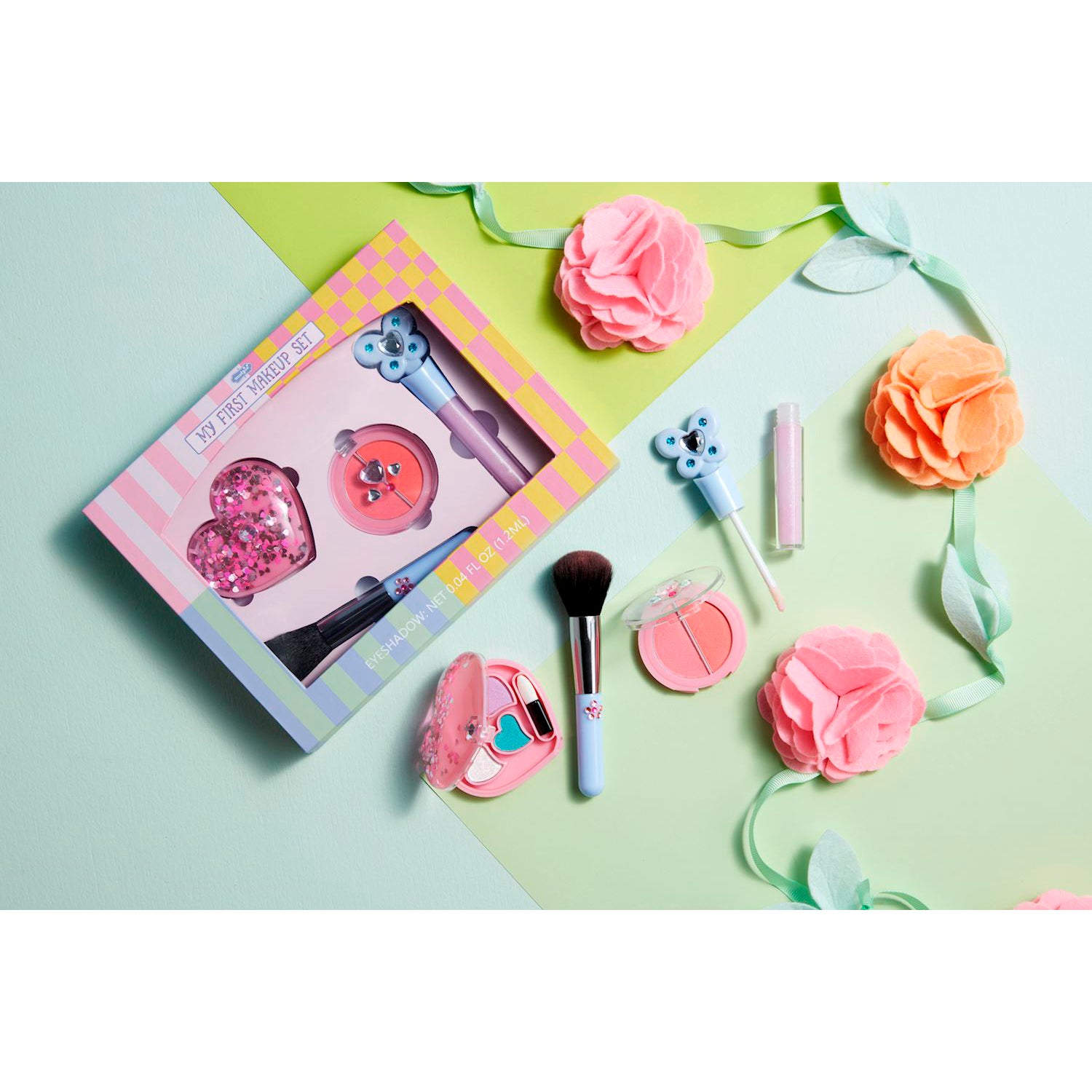 4-piece set includes: glitter lip gloss, eye shadow compact, blush, and make-up brush. Comes in paper wrapped gift box with magnetic closure. Ages 3+.